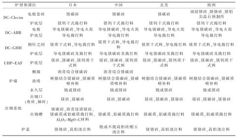 摘 要:由三根電極的普通交流電弧爐發(fā)展為超高功率(UHP)及一根電極的直流(DC)電弧爐,爐體結構有一些改變。針對各部位的損毀因素,內(nèi)襯用的耐火材料也有所發(fā)展。例如普通電弧爐的爐頂用高鋁磚、爐墻鎂磚砌筑,而UHP及DC電弧爐采用大面積水冷爐頂、爐墻,爐頂三角區(qū)采用剛玉澆注料或預制件,爐墻用鎂碳磚,蝕損嚴重部位采用噴補作業(yè)。還介紹了日本等一些國家DC和UHP的各種爐型用耐火材料。煉鋼電弧爐是以電極端部和爐料之間發(fā)生的電弧為熱能進行煉鋼的設備。電弧爐以廢鋼為爐料直接煉鋼,與礦石煉鐵后再煉鋼相比,基建投資少,節(jié)能60%、節(jié)水40%、減少廢氣排放86%、減少廢渣97%[1]。交流電弧爐歷史悠久,交流電是通過三根石墨電極輸入爐內(nèi),在電極下端與金屬料之間產(chǎn)生電弧,利用電弧高溫直接加熱爐料,使煉鋼過程得以進行。供電功率越高,爐料熔化速度越快,降低能量消耗越多,因此出現(xiàn)超高功率(UHP)電弧爐。在超高功率的基礎上發(fā)展了直流(DC)電弧爐煉鋼。直流電弧爐是以一根石墨電極的端點為陰極,爐底為陽極,石墨電極位于爐膛中心部位。與UHP相比設備結構簡單,建設費用低,熔池中的電流與熱量分布比較均勻,不存在過熱區(qū)域,因此耐火材料損耗比較小、節(jié)能且噪音小等。目前,煉鋼電弧爐向大型化、控制自動化方向發(fā)展。我國的電弧爐主要用來生產(chǎn)合金鋼。煉鋼水平與工業(yè)發(fā)達國家相比差距較大,如2015年我國電爐鋼占粗鋼總產(chǎn)量的6.1%,2020年有所提高,但也不超過10%,與世界平均水平的30%相比還有較大差距。我國已經(jīng)引進先進水平的UHP和DC電弧爐,隨著經(jīng)濟發(fā)展,工業(yè)化程度提高,必然伴以廢鋼資源數(shù)量增加,同時發(fā)展鐵礦石直接還原煉鐵技術,代替廢鋼,增加電弧爐煉鋼的爐料,還有核電的發(fā)展,使電弧爐煉鋼有了物質(zhì)保證。電弧爐的內(nèi)襯是耐火材料構成的,隨著UHP和DC技術的發(fā)展,需要新型優(yōu)質(zhì)耐火材料與之相配套。有人說[2]:沒有優(yōu)質(zhì)爐襯、爐底耐火材料支持長壽爐齡,超高功率電弧爐就無法發(fā)揮高效生產(chǎn)的優(yōu)勢。爐底耐火材料是直流電弧爐得以實現(xiàn)的必要條件,反映了煉鋼與耐火材料技術的互相影響,互為依存,在電弧爐煉鋼系統(tǒng)優(yōu)化生產(chǎn)中有不可分割的作用。1 電弧爐的結構變化傳統(tǒng)的電弧爐由爐頂(又稱爐蓋)、爐墻、爐坡、爐底和出鋼槽構成,全部用耐火材料構筑,外包鋼制爐殼。爐墻一側設有爐門,另一側為出鋼口,并與出鋼槽相連。而UHP和DC電弧爐采用偏心爐底出鋼,使爐體由傾動式改為固定式,爐底有供氣攪拌設置,爐頂安裝氧-燃料燒嘴,在爐底偏心位置設置出鋼口,代替出鋼槽。由于取消了傾動設備,擴大了水冷面積,緩和了爐襯的損毀,適當降低了出鋼溫度,并縮短了出鋼時間,從而降低生產(chǎn)成本。爐墻采用鑲砌水冷箱式水冷套措施,其內(nèi)表面噴涂一層耐火涂料,使其掛渣形成保護層,可有效降低耐火材料消耗,但電耗可能增加。國外有的電弧爐功率達1 000 kV·A/t以上,爐墻壽命達2 000爐次以上,水冷爐蓋壽命達4 000爐次,降低耐火材料消耗60%以上。2 耐火材料內(nèi)襯的損毀因素電弧爐內(nèi)襯的耐火材料長期處于高溫、熔渣侵蝕和急熱急冷狀態(tài)下,工作條件極其惡劣。在煉鋼的熔化期和氧化期,不致于因高溫損壞爐襯,但在還原期的鋼液溫度相當高,又受電弧直接輻射(有時溫度達4 000℃以上),爐襯很容易造成熔融損壞。出完鋼裝料時,爐襯溫度突然下降,裝完料開始送電,溫度又逐漸升高,這種急冷急熱是爐襯剝落的直接原因,主要是爐頂容易剝落。耐火材料內(nèi)襯損毀的主要因素包括[3]:(1)化學侵蝕。FeO或渣中SiO2與耐火材料中的CaO、MgO之間的化學反應,使爐襯變?yōu)槿墼鴮е聯(lián)p毀。(2)耐火材料內(nèi)襯中的碳成分被含氧成分(如FeO、O2、MgO等)氧化,導致耐火材料脫碳而損毀。(3)沖刷和機械沖擊。鋼水或熔渣流過耐火材料表面,以物理性磨損或沖刷爐襯,而導致內(nèi)襯損毀;在出鋼口、渣線、電極口或排氣口平臺等沖刷嚴重,廢鋼等爐料吊入往往撞擊爐襯而損毀。(4)水化。在生產(chǎn)過程中,往往會出現(xiàn)爐頂或爐墻漏水或滲水,還有水蒸氣,與堿性耐火材料中的MgO、CaO進行水化反應,使內(nèi)襯損毀。3 電弧爐用耐火材料根據(jù)電弧爐的結構,由于各部位承受的熱負荷大小不同,與熔渣、鋼水接觸作用及機械損壞程度存在差異,不同部位必須采用不同的耐火材料[4]。3.1 爐頂(蓋)我國中小電弧爐普遍采用燒成或不燒高鋁磚,局部用高鋁質(zhì)或剛玉質(zhì)不定形耐火材料預制件。大型超高功率電弧爐和直流電弧爐采用水冷技術,除三角區(qū)外,爐頂耐火材料不是關鍵。三角區(qū)由于強烈熱震及電極熱輻射苛刻,國外普遍采用剛玉質(zhì)或鋁鉻質(zhì)搗打料,我國一般用高鋁質(zhì)或剛玉質(zhì)搗打料。天津鋼管集團公司150 t超高功率電弧爐,爐頂三角部分(三個電極孔周圍)采用鉻剛玉質(zhì)澆注料預制件,預先烘烤,現(xiàn)場直接使用,并解決了電極孔定位的難題。還針對氧槍上部損毀較快問題,在該區(qū)域采取局部加厚處理,使爐頂各部分損毀速度基本一致,最高壽命達676爐次。3.2 爐墻(壁)分為一般爐墻、渣線區(qū)和臨近電弧的熱點部位